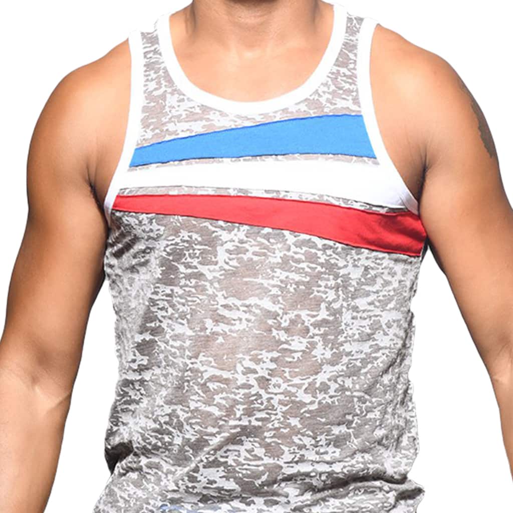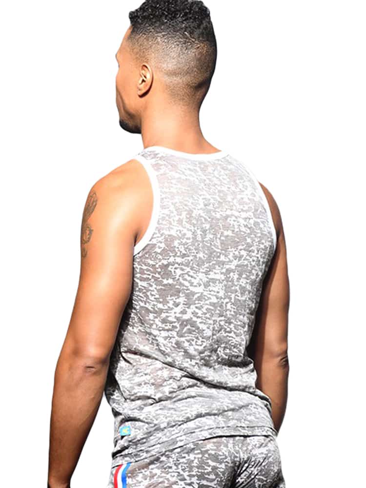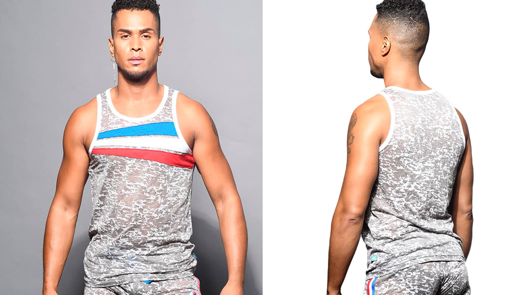 California Superhero to tank top od Andrew Christian, wykonany z częściowo przezroczystej bawełny i poliestru. Dlatego jest lekki, szybko schnie i jest idealny dla wysportowanego mężczyzny. Tank top z okrągłym dekoltem dostępny jest w jasnoszarym kolorze z kontrastującymi paskami na piersi.