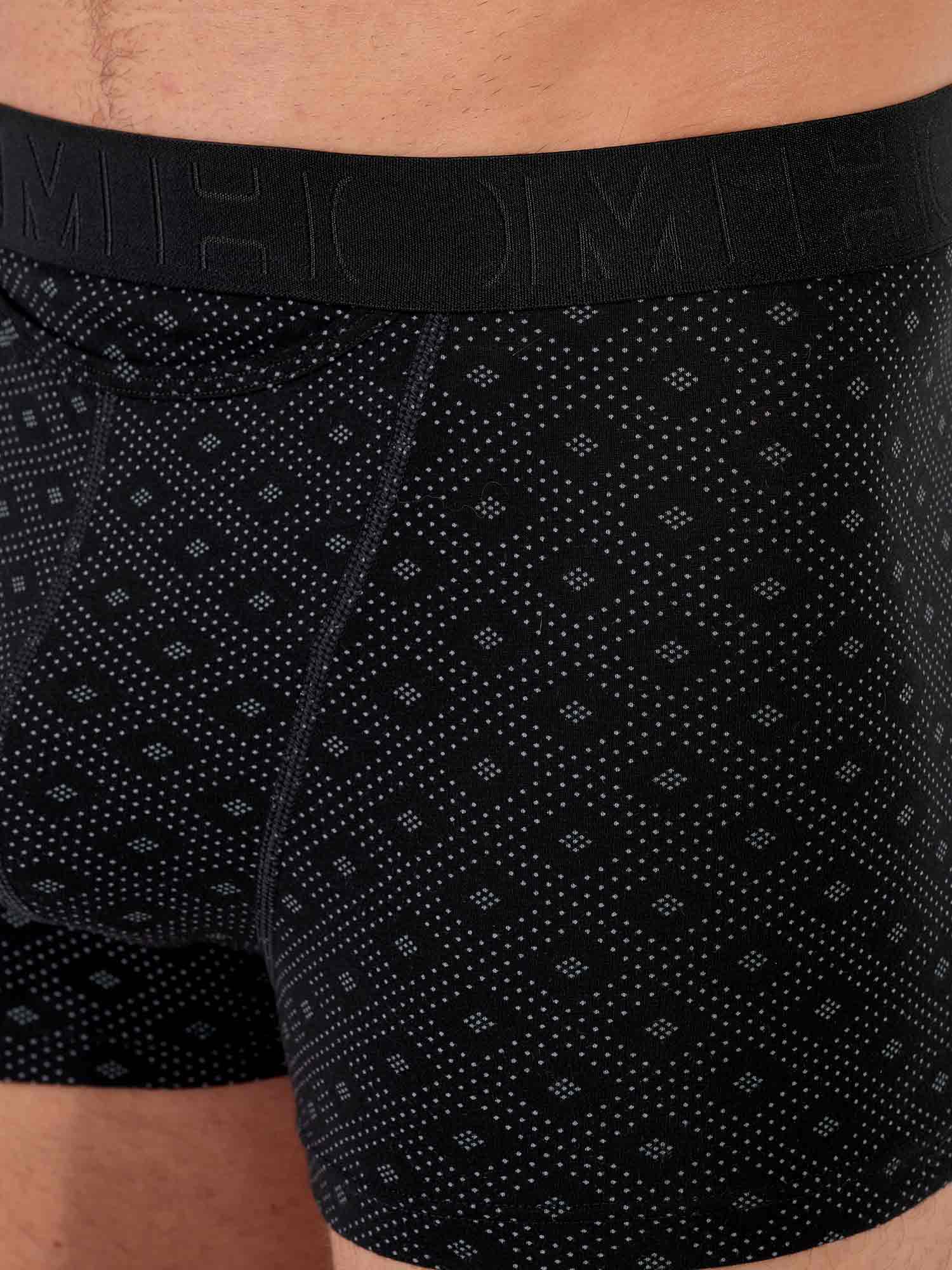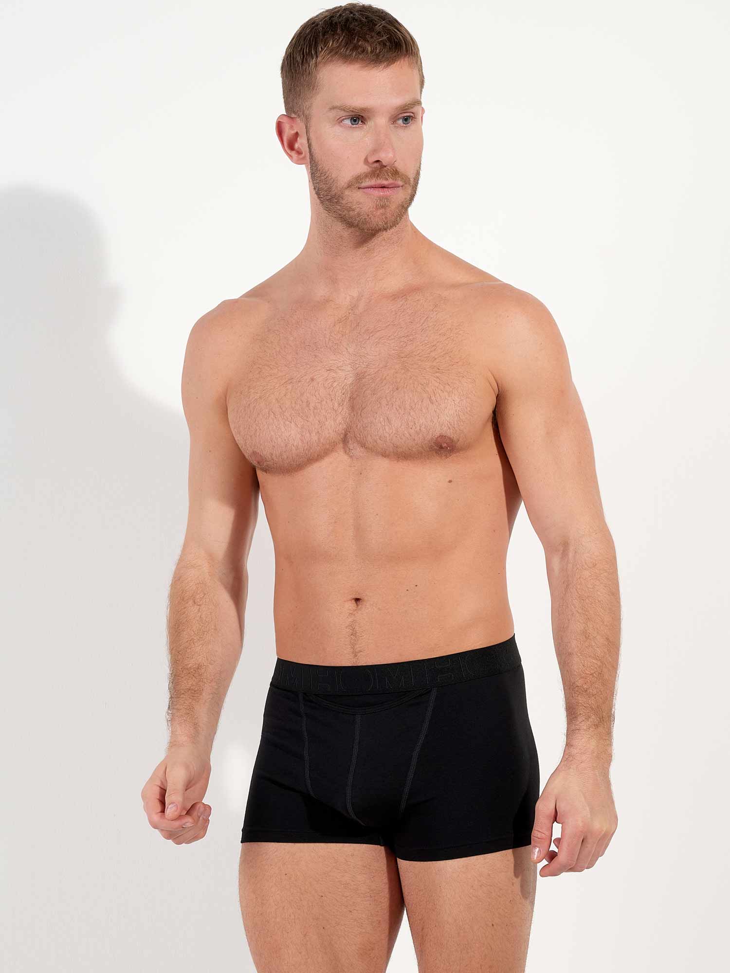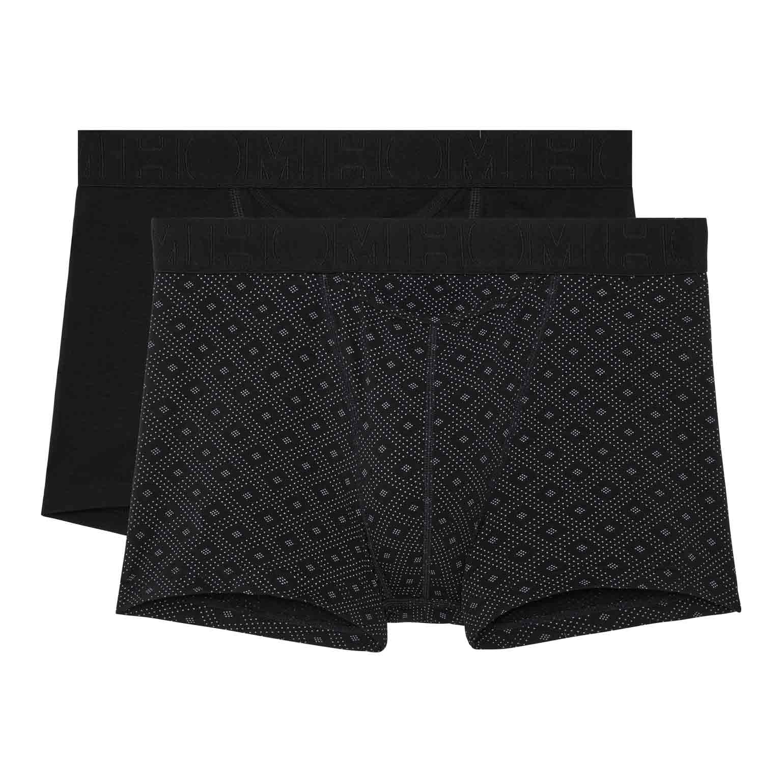 Il set include un boxer nero tinta unita e uno con una raffinata microstampa in stile cravatta. La tasca anteriore è foderata per un supporto extra, mentre la cintura elastica presenta il logo HOM lungo tutta la circonferenza. Una scelta ideale per chi cerca comfort e stile.
