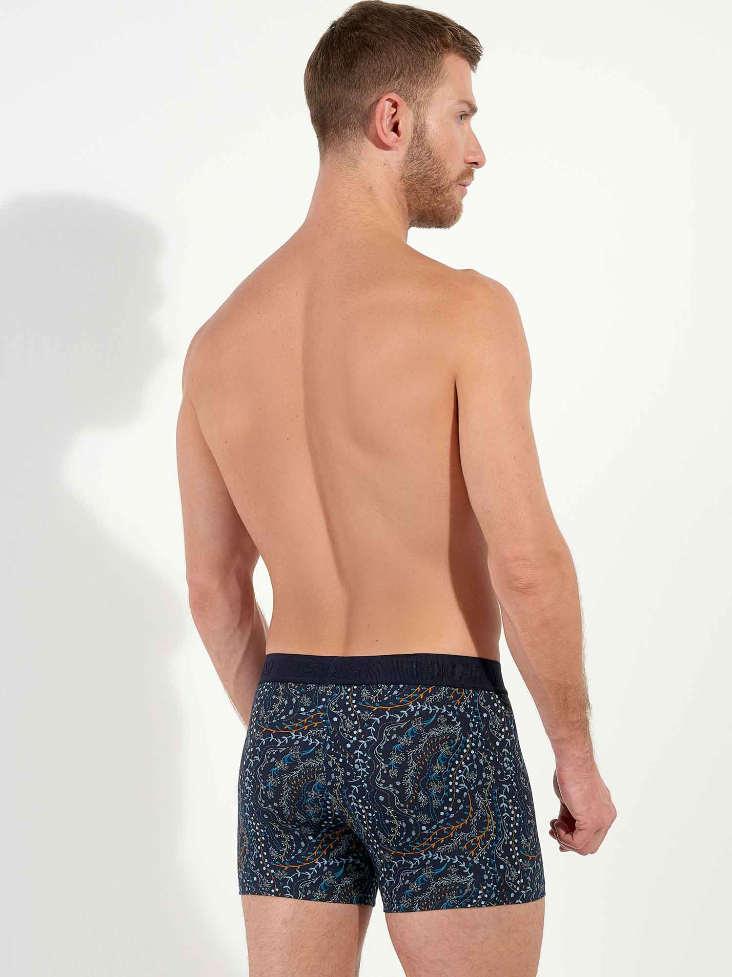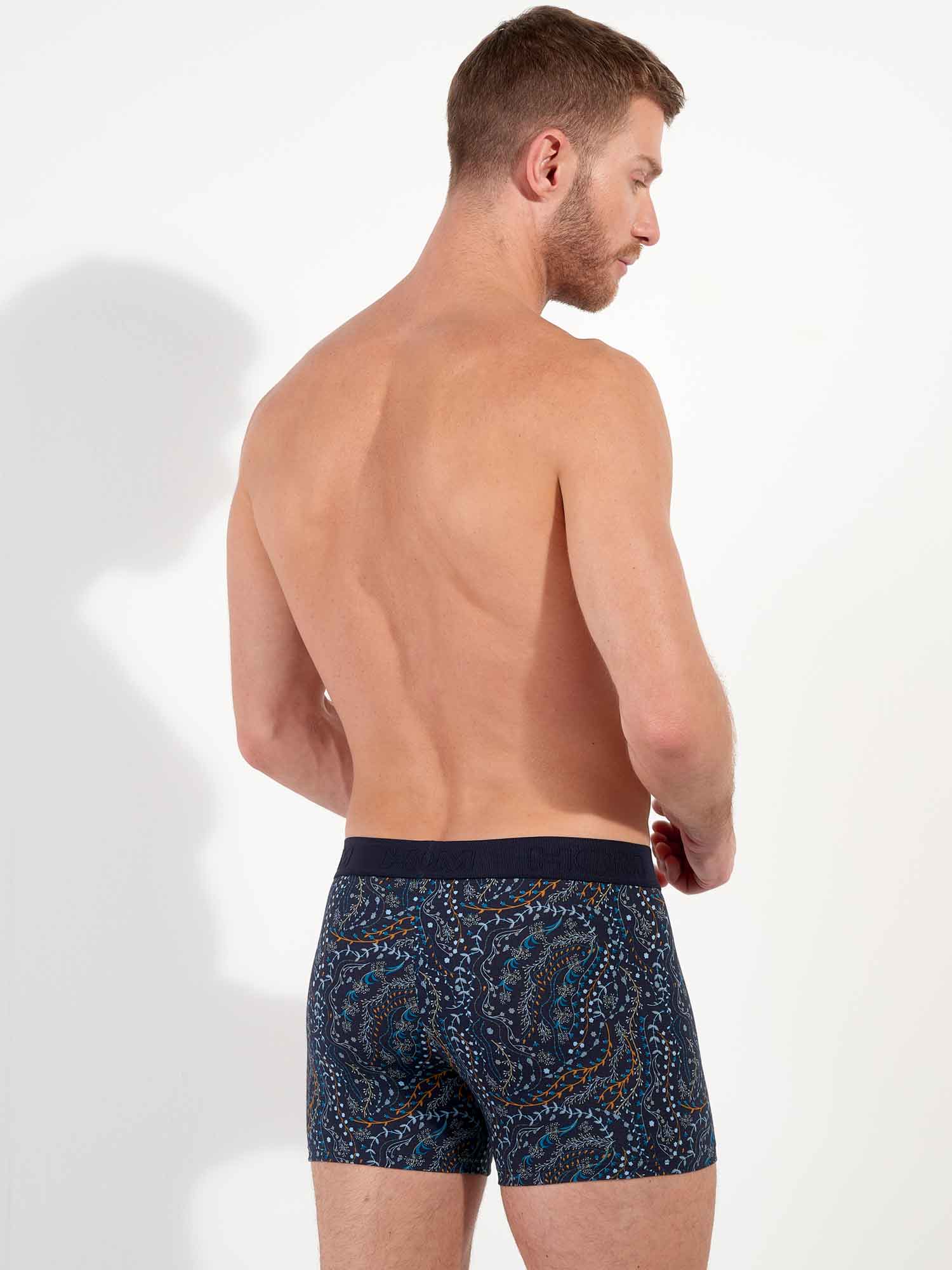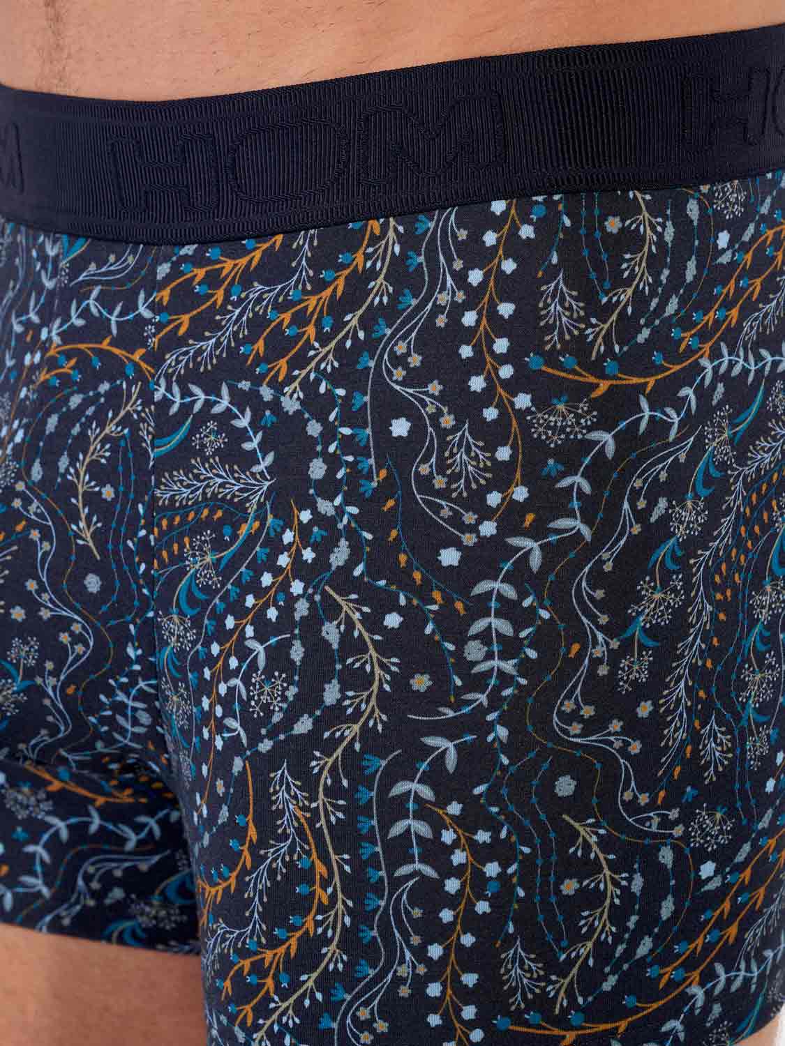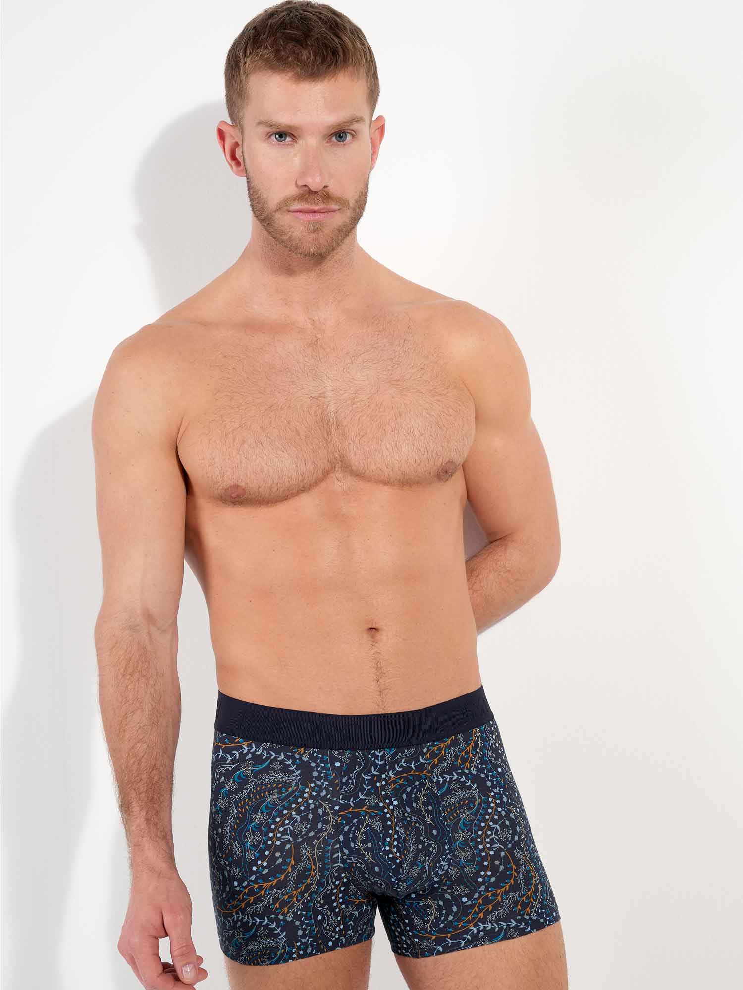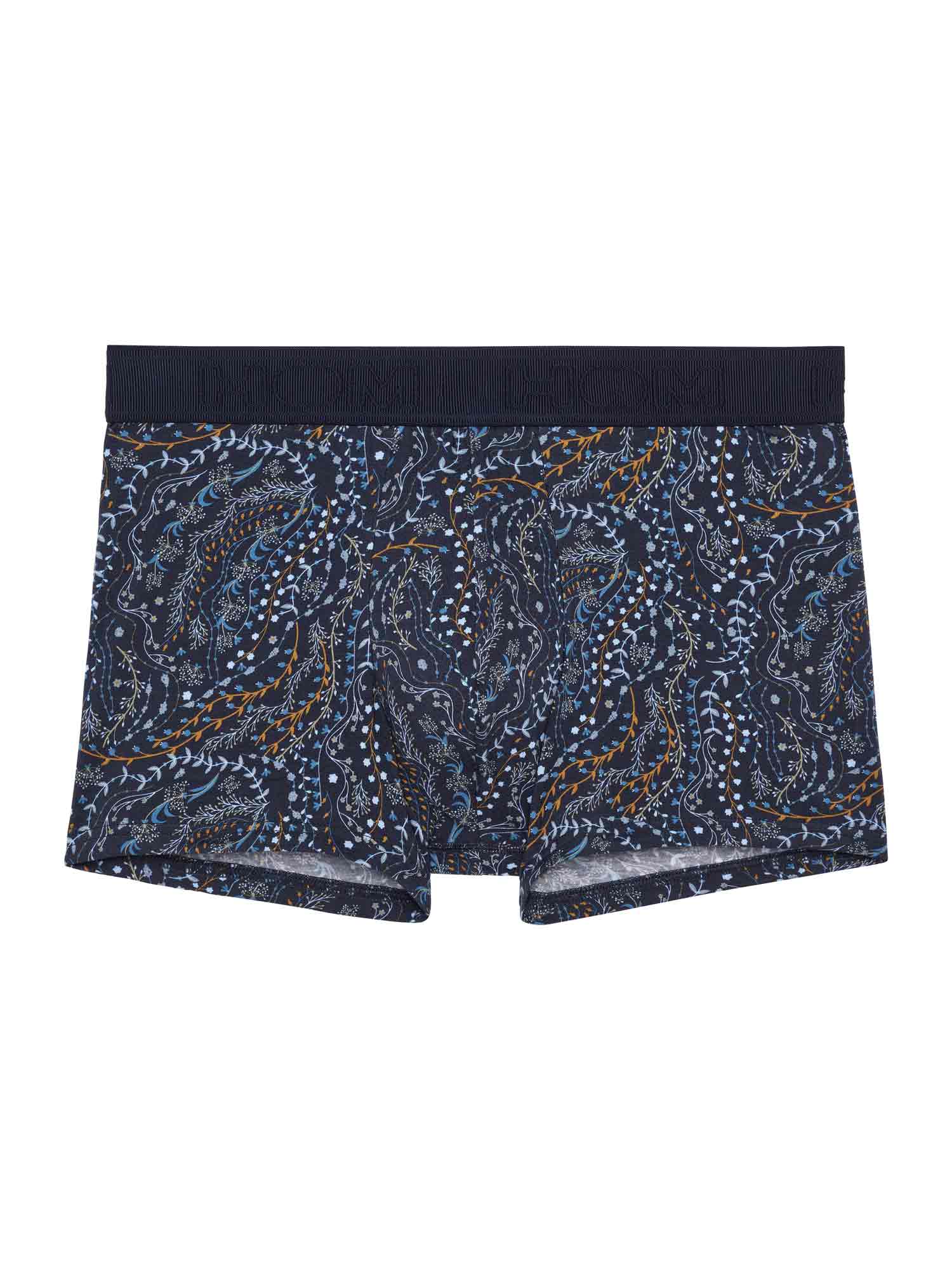 Fontainebleau boxer briefs łączą wygodny krój z eleganckim, naturalnym wyglądem. Botaniczny wzór z drobnymi gałązkami i liśćmi na granatowym tle dodaje subtelnego, sezonowego akcentu, zachowując jednocześnie klasę. Oddychająca mieszanka modalu i bawełny oraz miękka podszewka z przodu zapewniają komfort przez cały dzień.