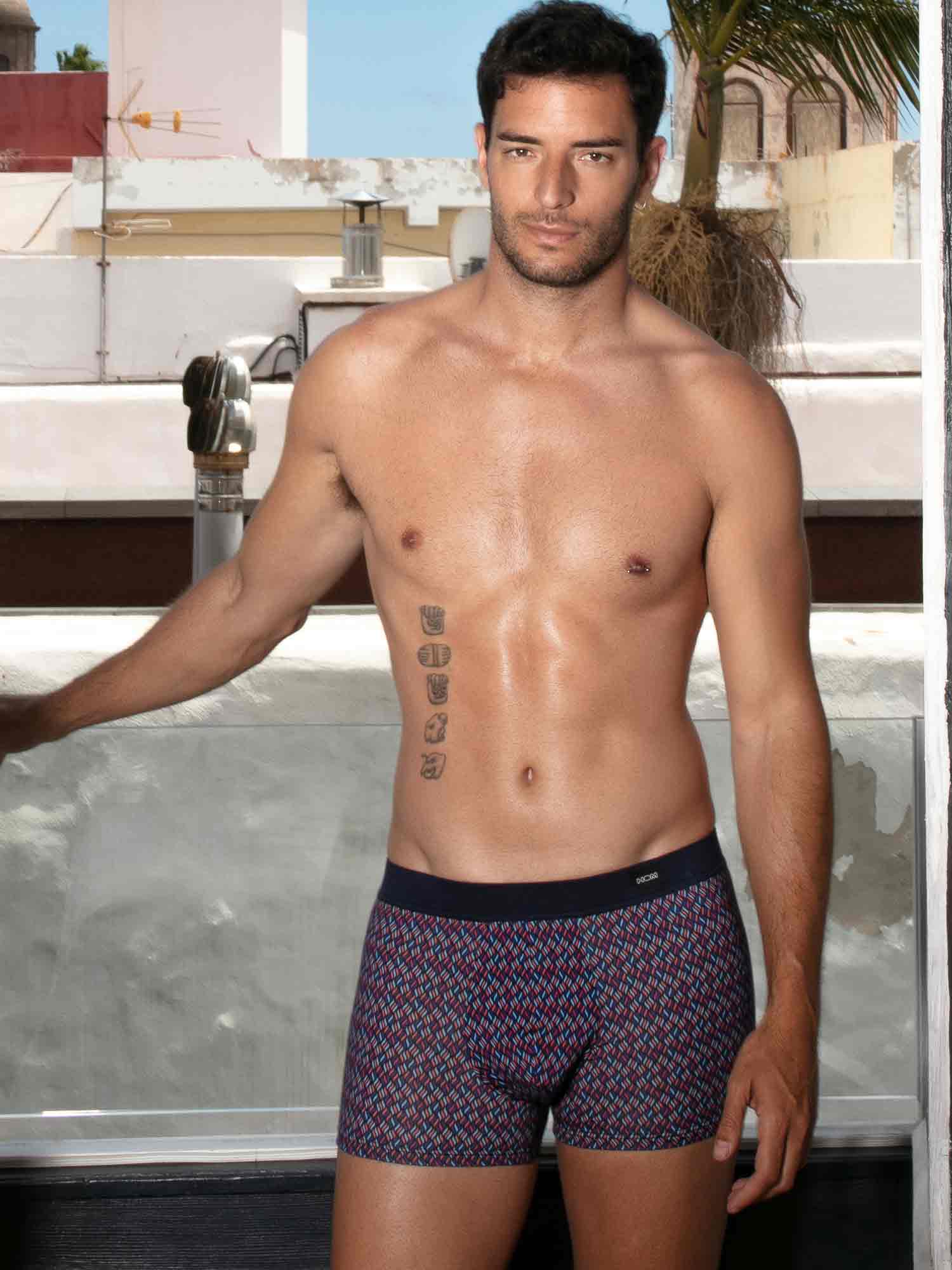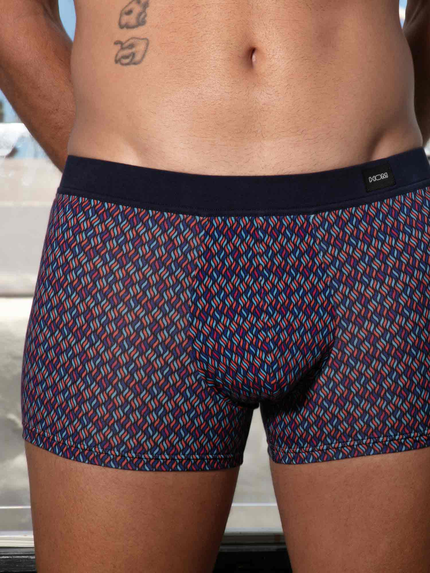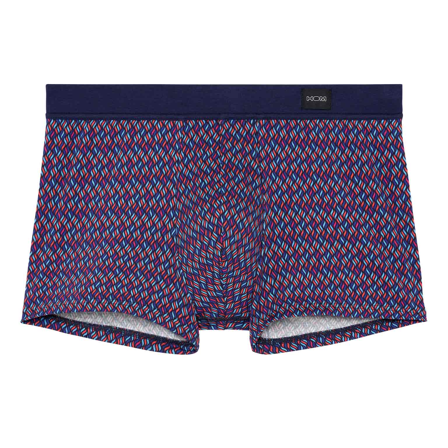 Ocean Drive Comfort Boxer Briefs przywołują nocne Miami dzięki wyrazistemu wzorowi przypominającemu wielokolorowe płomienie na granatowym, nocnym tle, jak światła miasta i reflektory Cadillaca na Ocean Drive. Krój jest wygodny i zapewnia wsparcie, idealny na co dzień, z czystą sylwetką i gładkim odczuciem. Pas comfort jest w całości pokryty tkaniną, dzięki czemu gumka nie dotyka skóry, dla bardziej miękkiego, luksusowego komfortu.