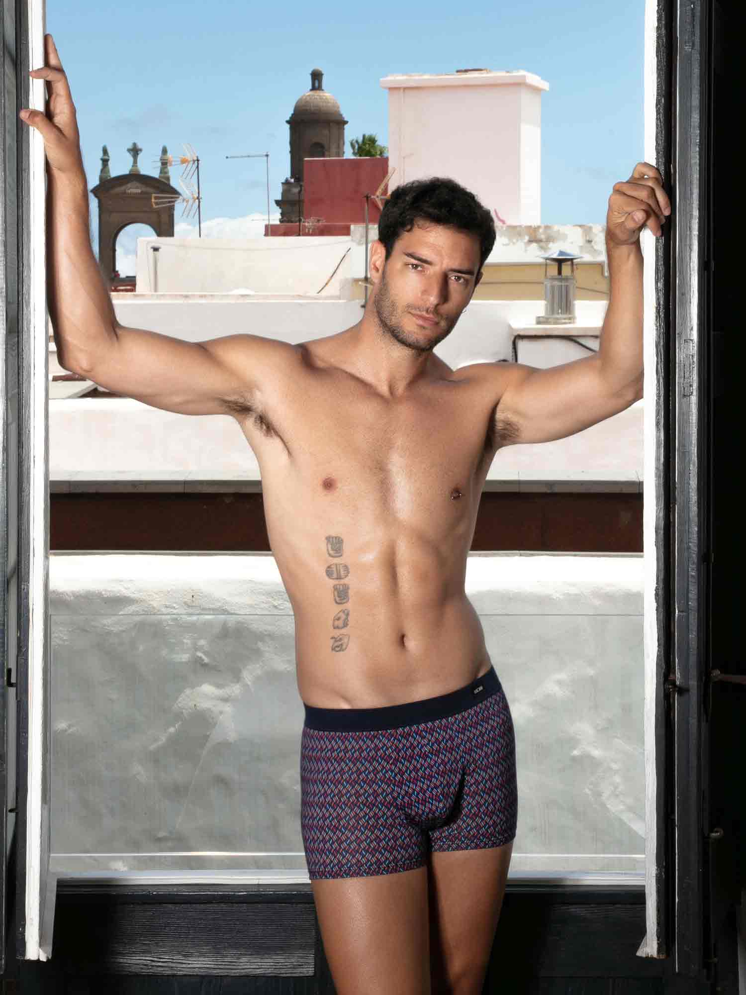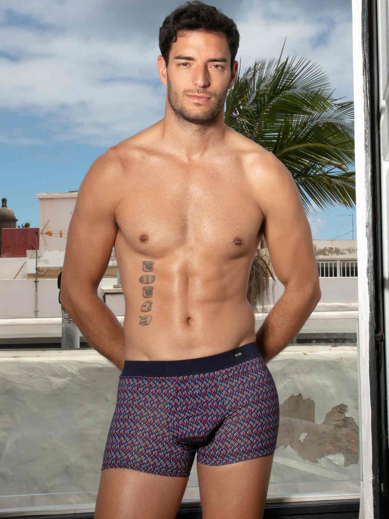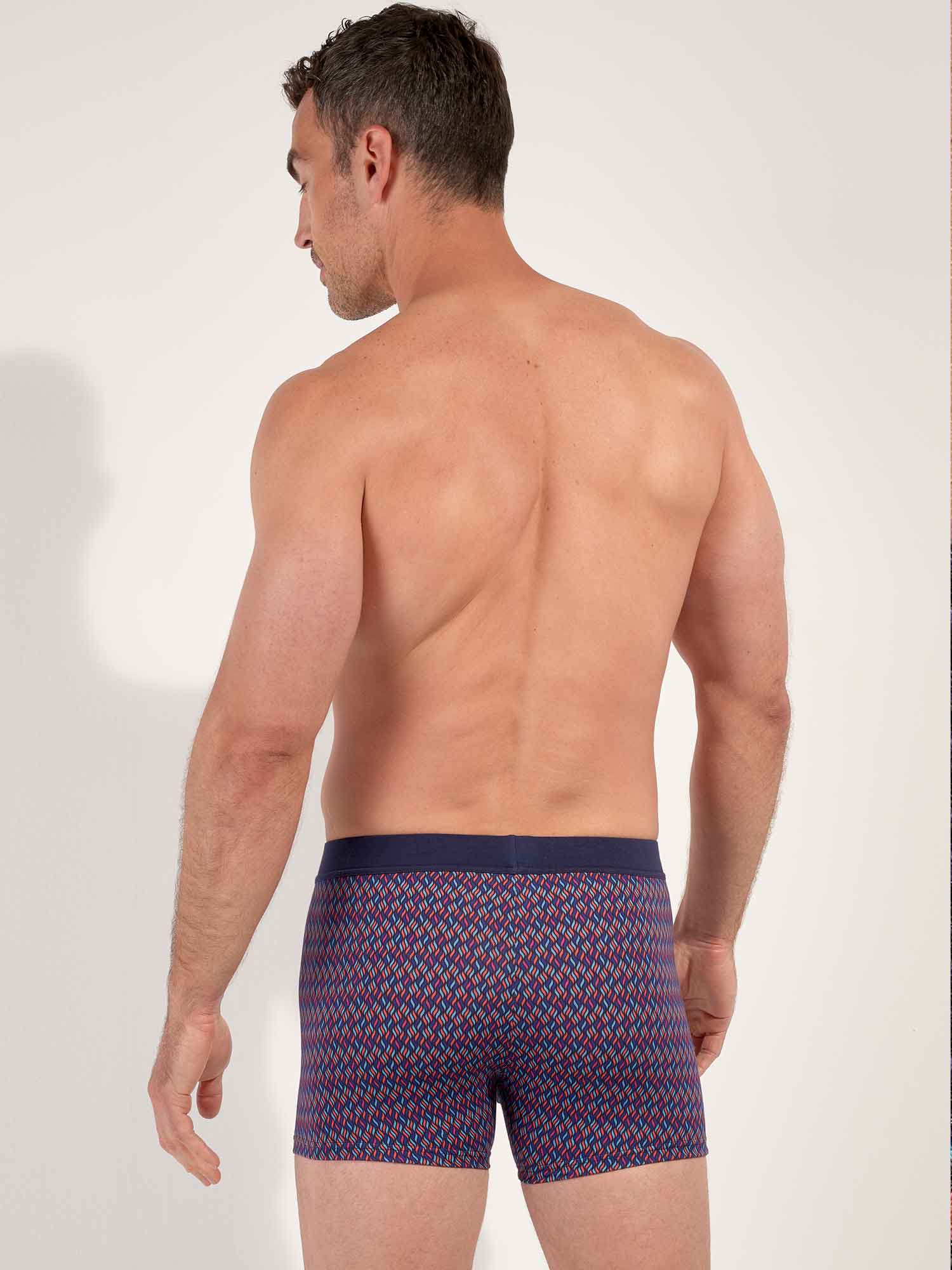 Ocean Drive Comfort Boxer Briefs przywołują nocne Miami dzięki wyrazistemu wzorowi przypominającemu wielokolorowe płomienie na granatowym, nocnym tle, jak światła miasta i reflektory Cadillaca na Ocean Drive. Krój jest wygodny i zapewnia wsparcie, idealny na co dzień, z czystą sylwetką i gładkim odczuciem. Pas comfort jest w całości pokryty tkaniną, dzięki czemu gumka nie dotyka skóry, dla bardziej miękkiego, luksusowego komfortu.