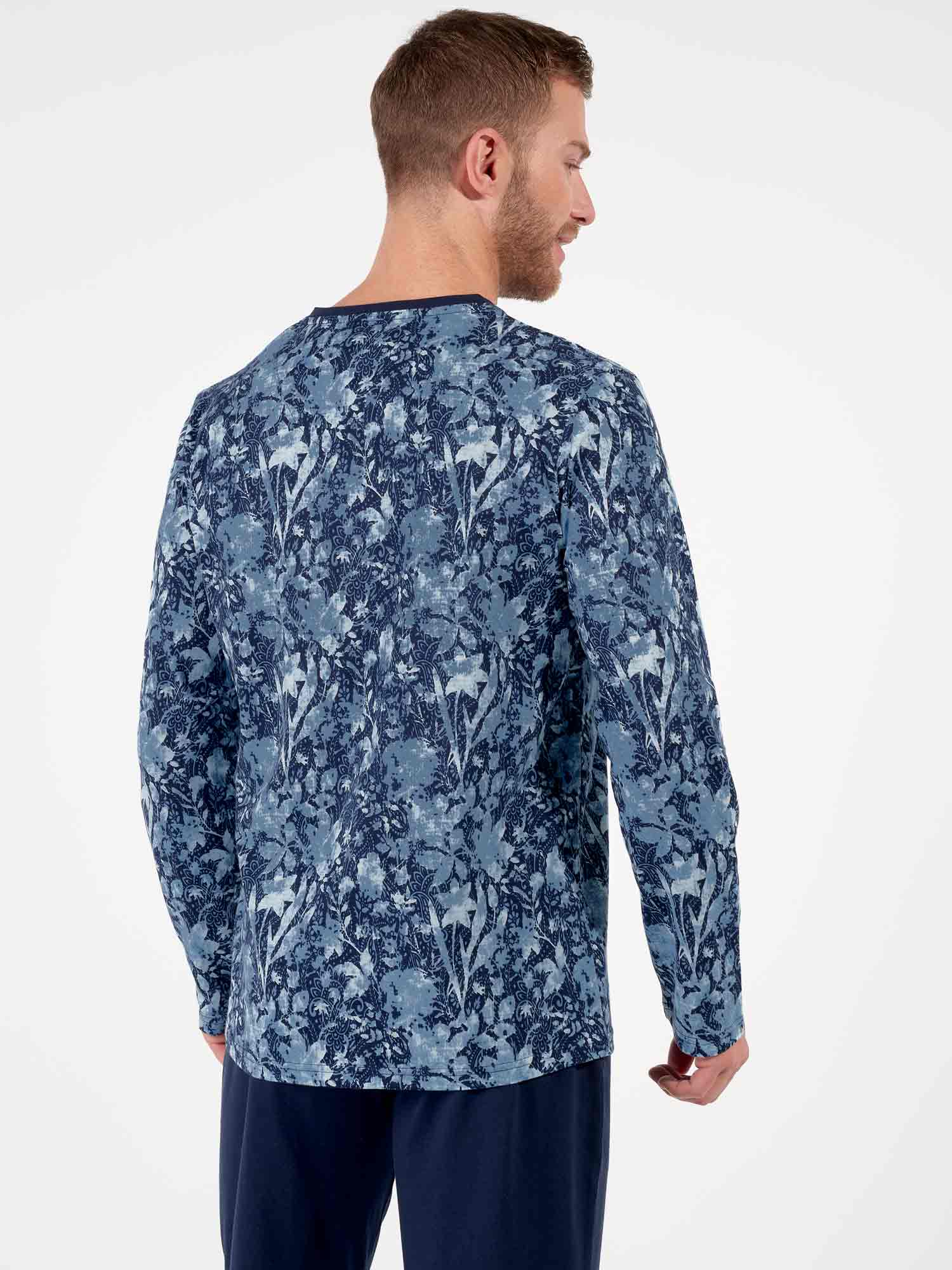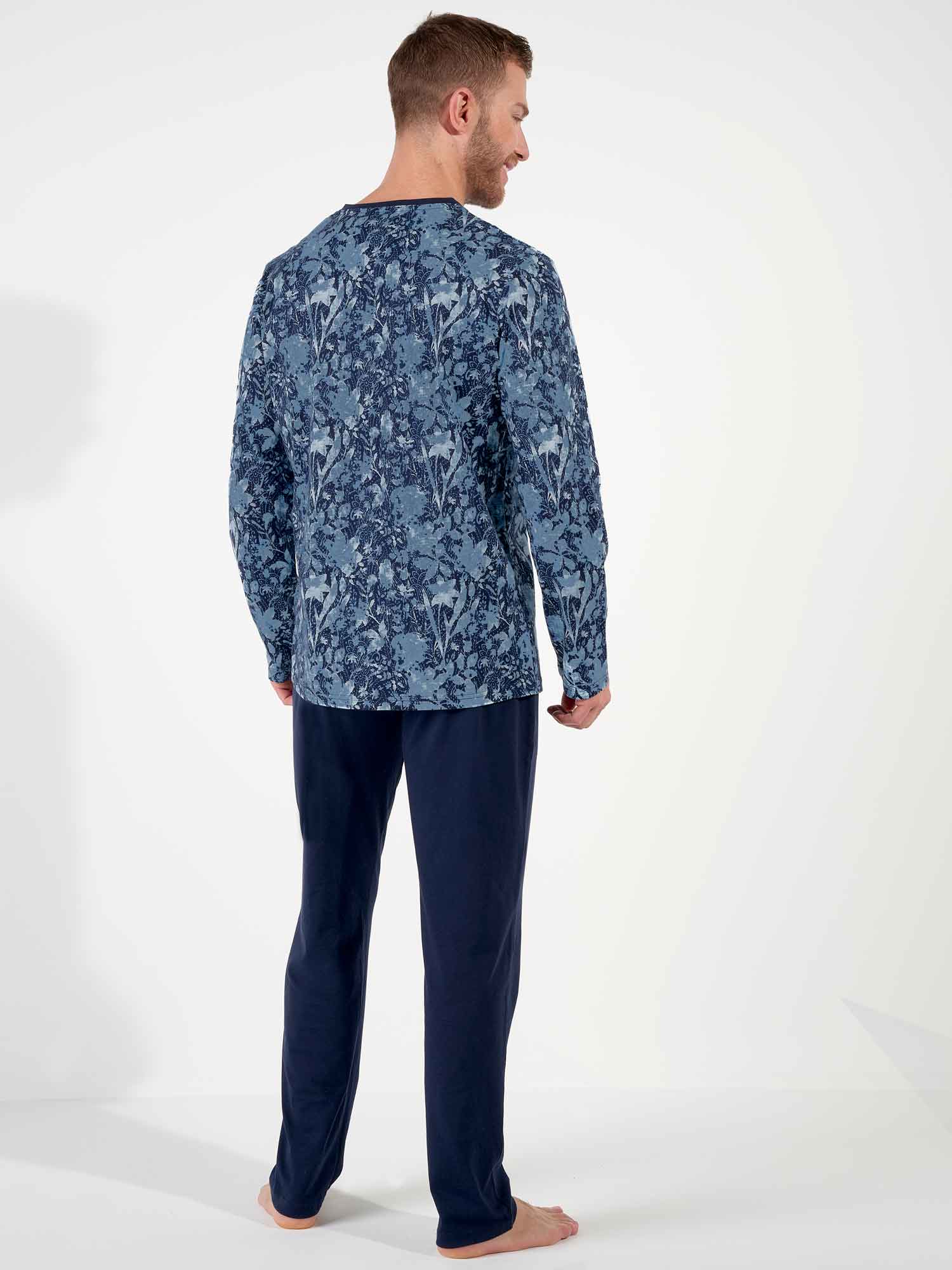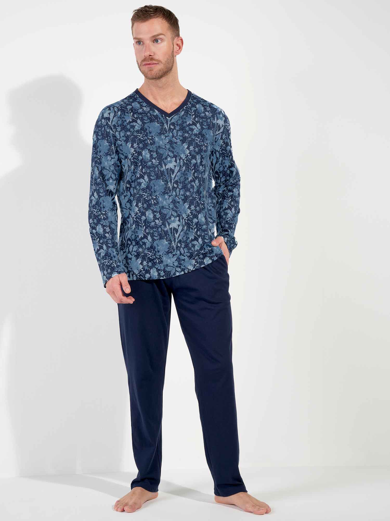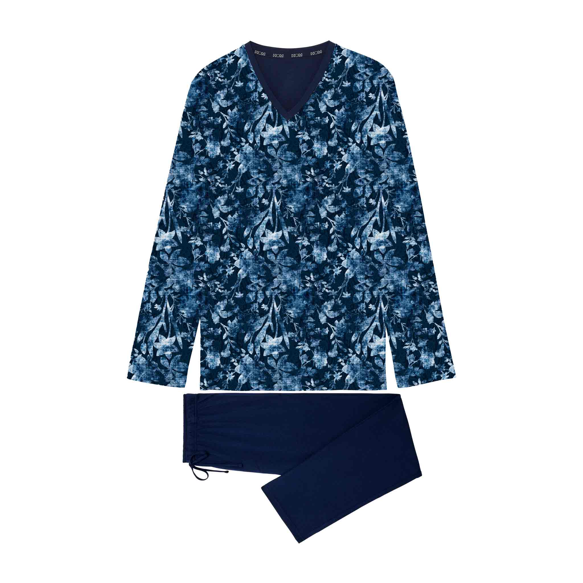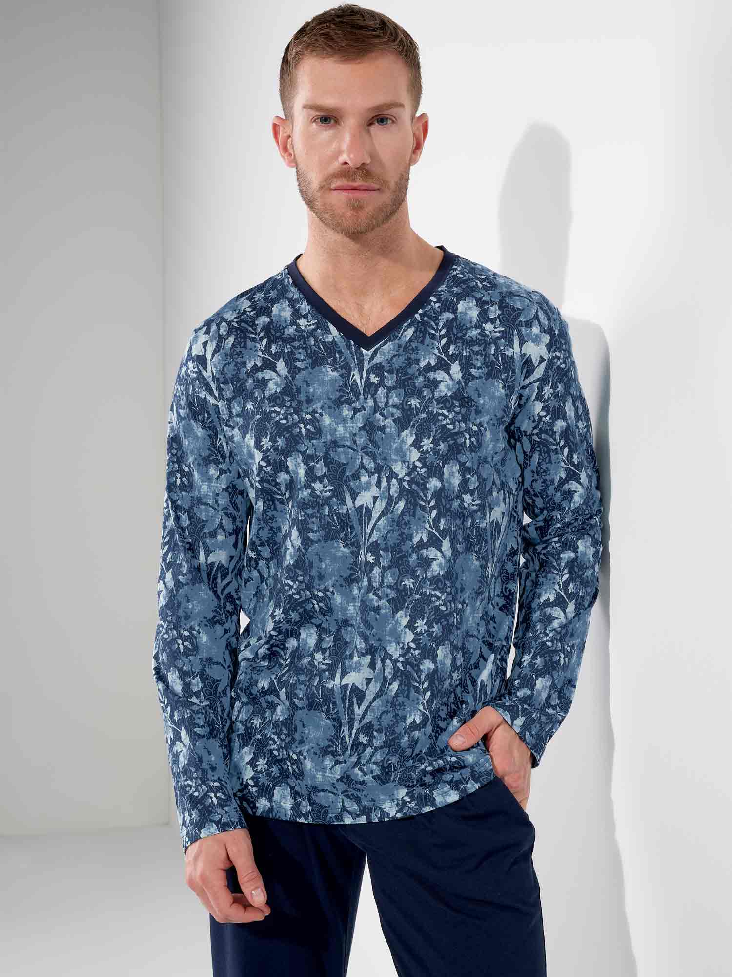 Piżama Compiegne łączy artystyczny styl z wygodnym charakterem. Wykonana w 100% z bawełny, jest przyjemna i miękka dla skóry. Górna część piżamy ma kwiatowy wzór w odcieniach niebieskiego przypominający malowidło akwarelowe. Dekolt w serek z ciemnogranatową lamówką oraz subtelne logo HOM nadają całości elegancji. Gładkie, ciemnogranatowe spodnie z prostymi nogawkami i troczkiem zapewniają wygodę podczas snu i odpoczynku. Stylowy wybór dla mężczyzn, którzy cenią charakter i komfort.