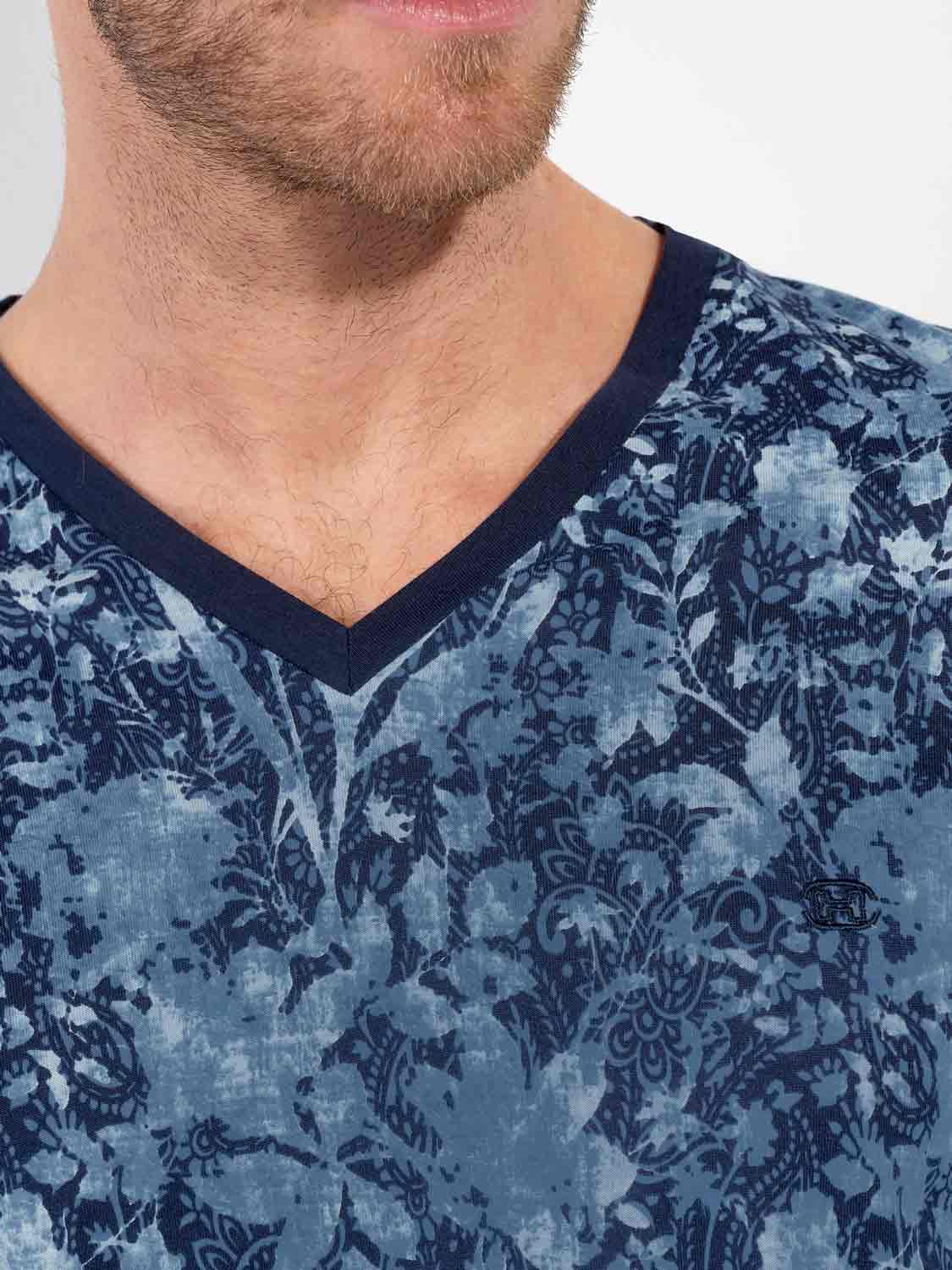 • Kwiatowy nadruk akwarelowy w odcieniach jeansu na ciemnogranatowym tle