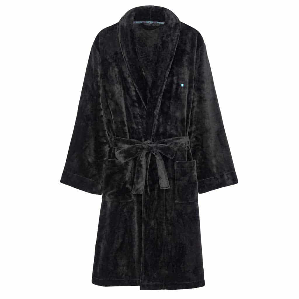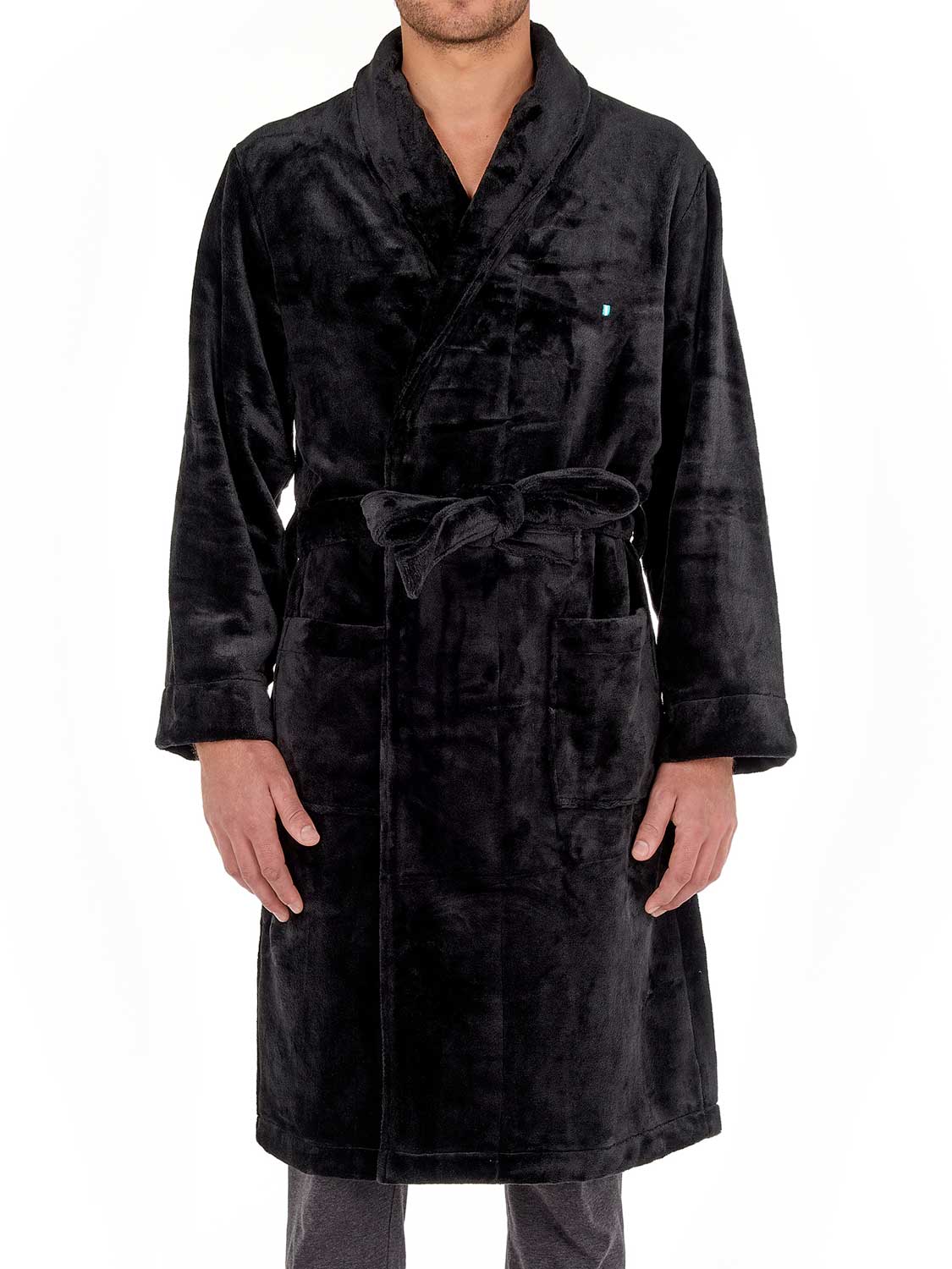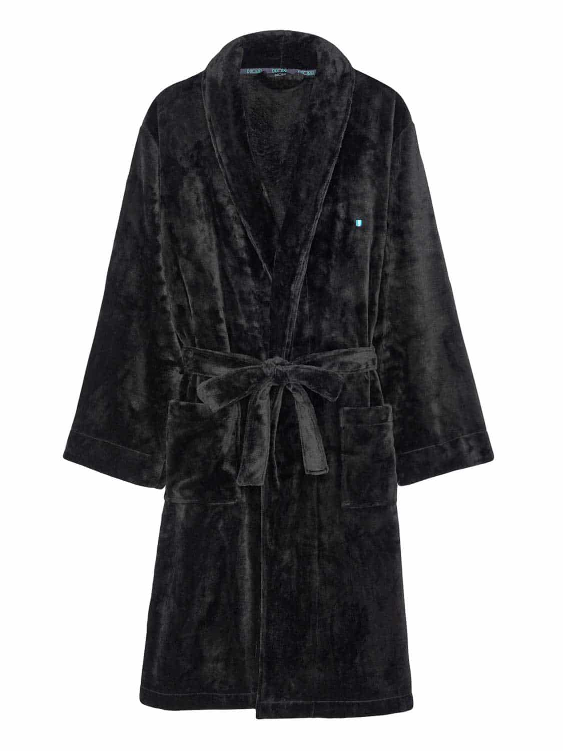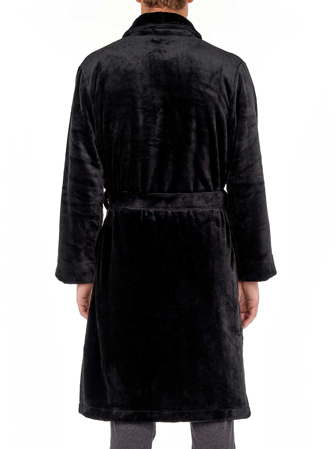Szlafrok Robe - Nice jest długi i sięga poniżej kolan. Szlafrok wykonany jest z grubego, miękkiego poliestrowego materiału polarowego, który doskonale reguluje temperaturę i utrzymuje ciepło. Szlafrok jest czarny z delikatnym połyskiem. Dekolt wykończony jest od wewnątrz taśmą z logo HOM. Szlafrok wiązany jest paskiem wokół talii.