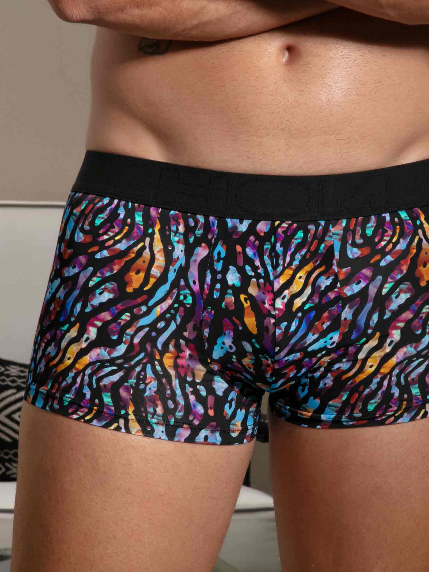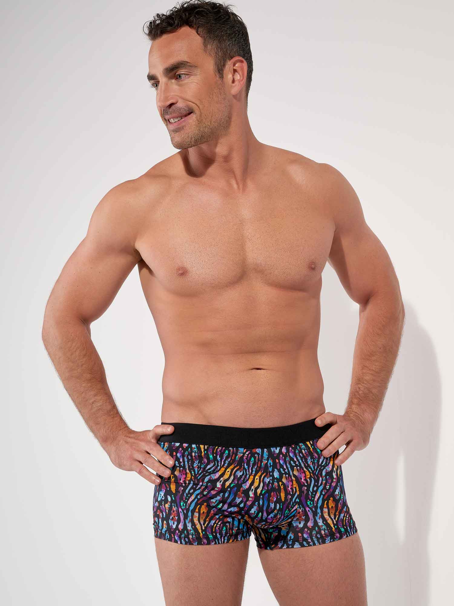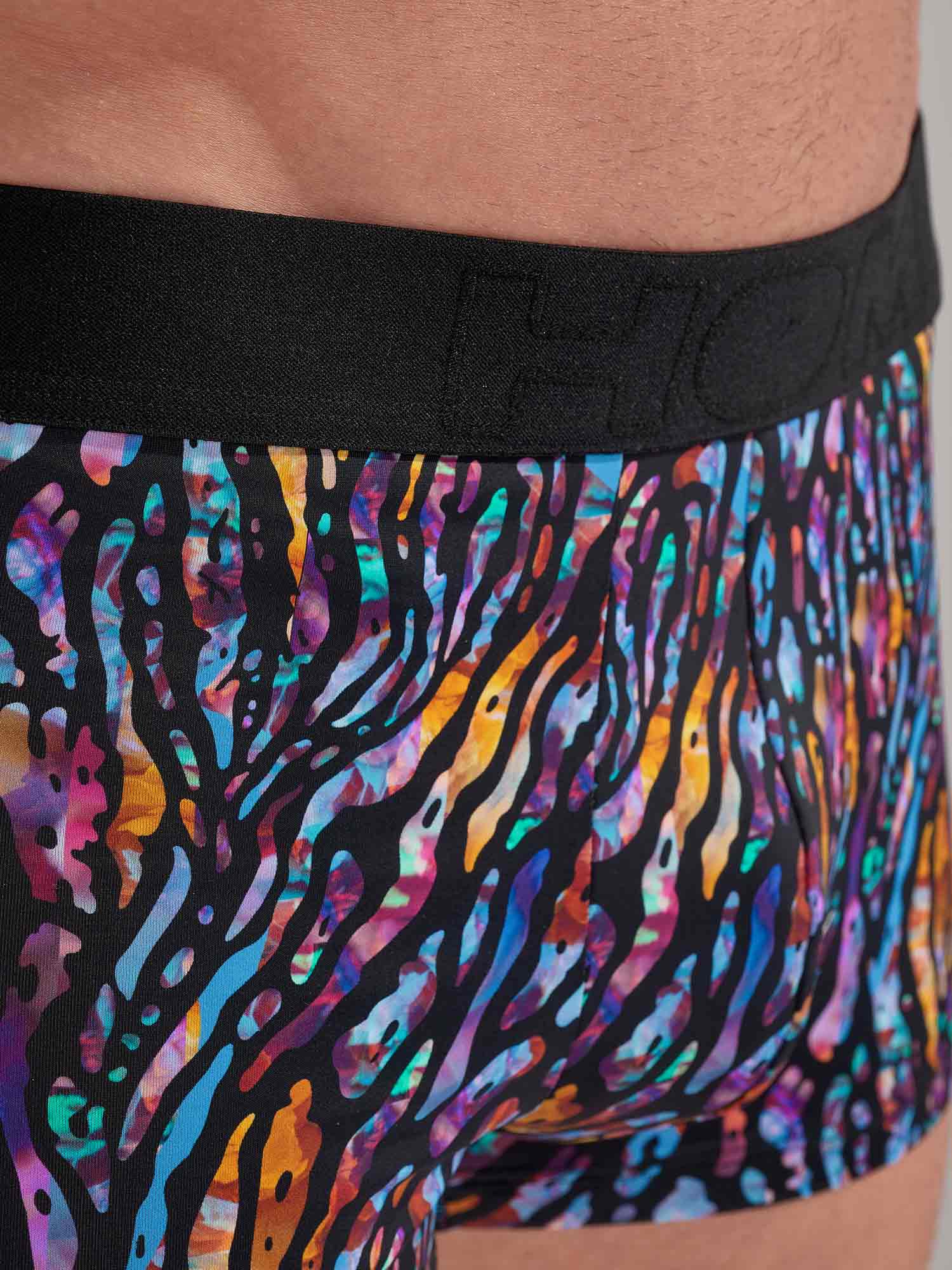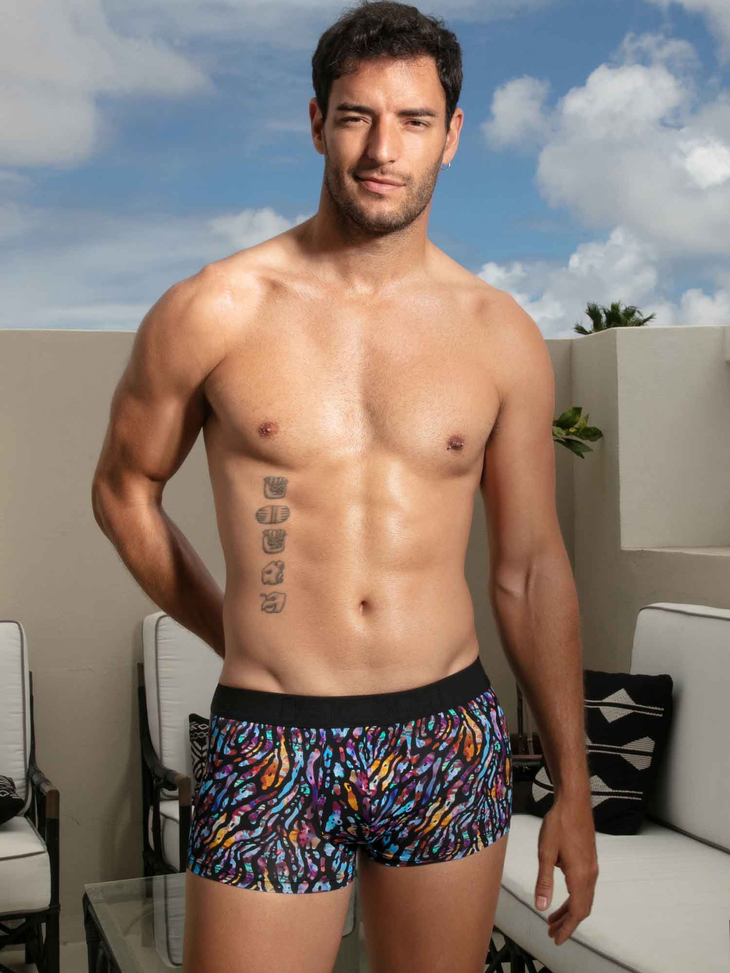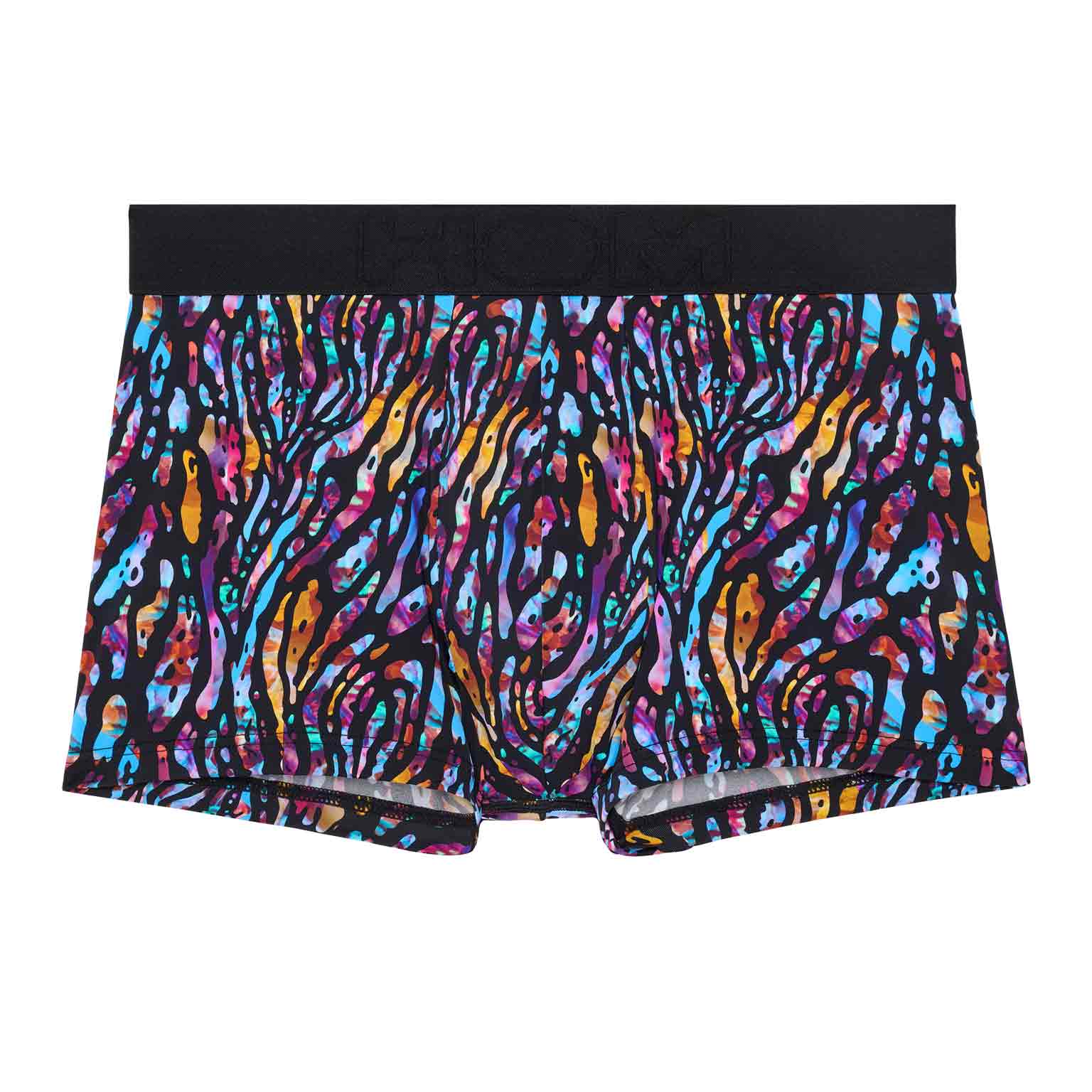 Miami Trunk wnosi tropikalną energię w nowoczesnym, funkcjonalnym kroju. Krótka forma układa się wysoko na udzie, zapewnia dynamiczny wygląd i swobodę ruchu. Wzór łączy stylizowany czarny motyw animal z intensywnie kolorowym tłem inspirowanym dżunglą, przywodzi na myśl barwy i rytm egzotycznej flory i fauny. Bezszwowy pas HOM daje stabilne podtrzymanie bez ucisku i rolowania, a dyskretny elastyczny panel zintegrowany w obszyciu nogawki pomaga utrzymać trunk gładko na miejscu, dla czystego i wygodnego dopasowania przez cały dzień. Odczepiana metka pielęgnacyjna dodatkowo zwiększa komfort, od rana do wieczora.