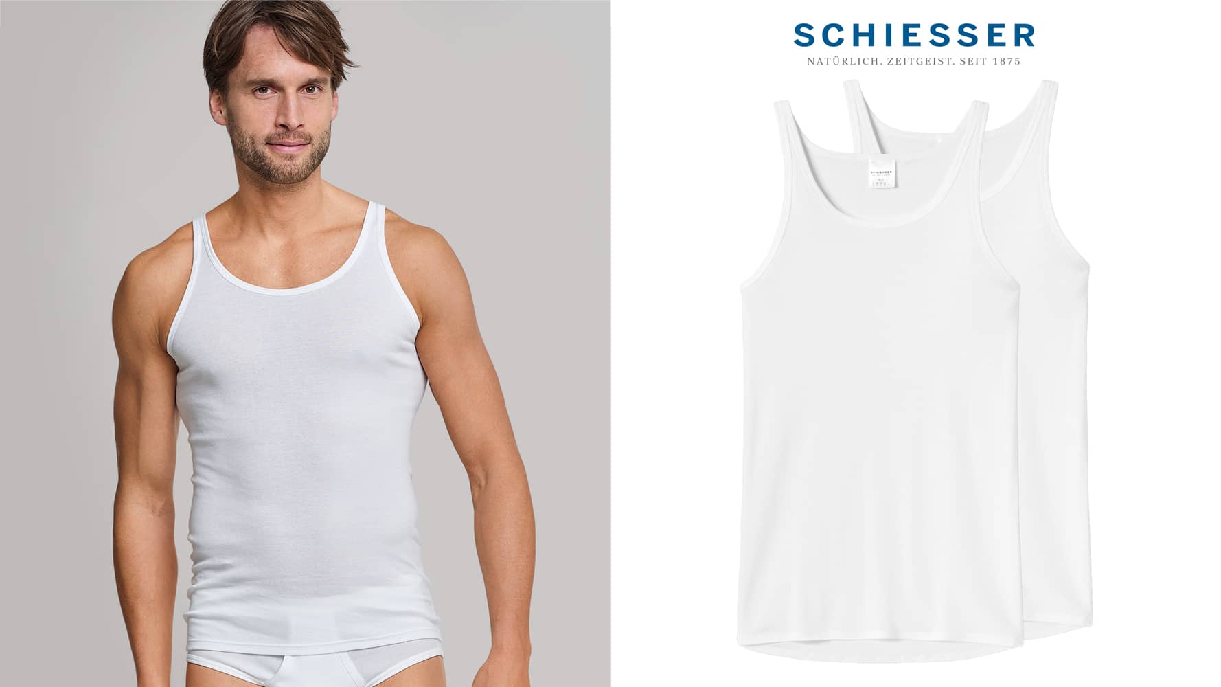 Prawdziwy oryginał w opakowaniu 2-pack! Ta męska podkoszulka z serii "Classics" marki SCHIESSER łączy przyjemnie miękki materiał o sprawdzonej, najwyższej jakości z klasycznym designem. Jak sama nazwa wskazuje, seria Original Feinripp charakteryzuje się drobnym prążkiem i jest wykonana w 100% z superczesanej bawełny, dzięki czemu ta męska podkoszulka jest niewątpliwie miękka w dotyku. Koszulka ma nieco dłuższy tył i jest dzianiną okrężną, co zapewnia brak szwów, co pozwala cieszyć się optymalnym komfortem noszenia z tą męską podkoszulką z kolekcji Original Feinripp. Idealna dla mężczyzn, którzy kochają klasyczną odzież codzienną i cenią sobie dobre dopasowanie.